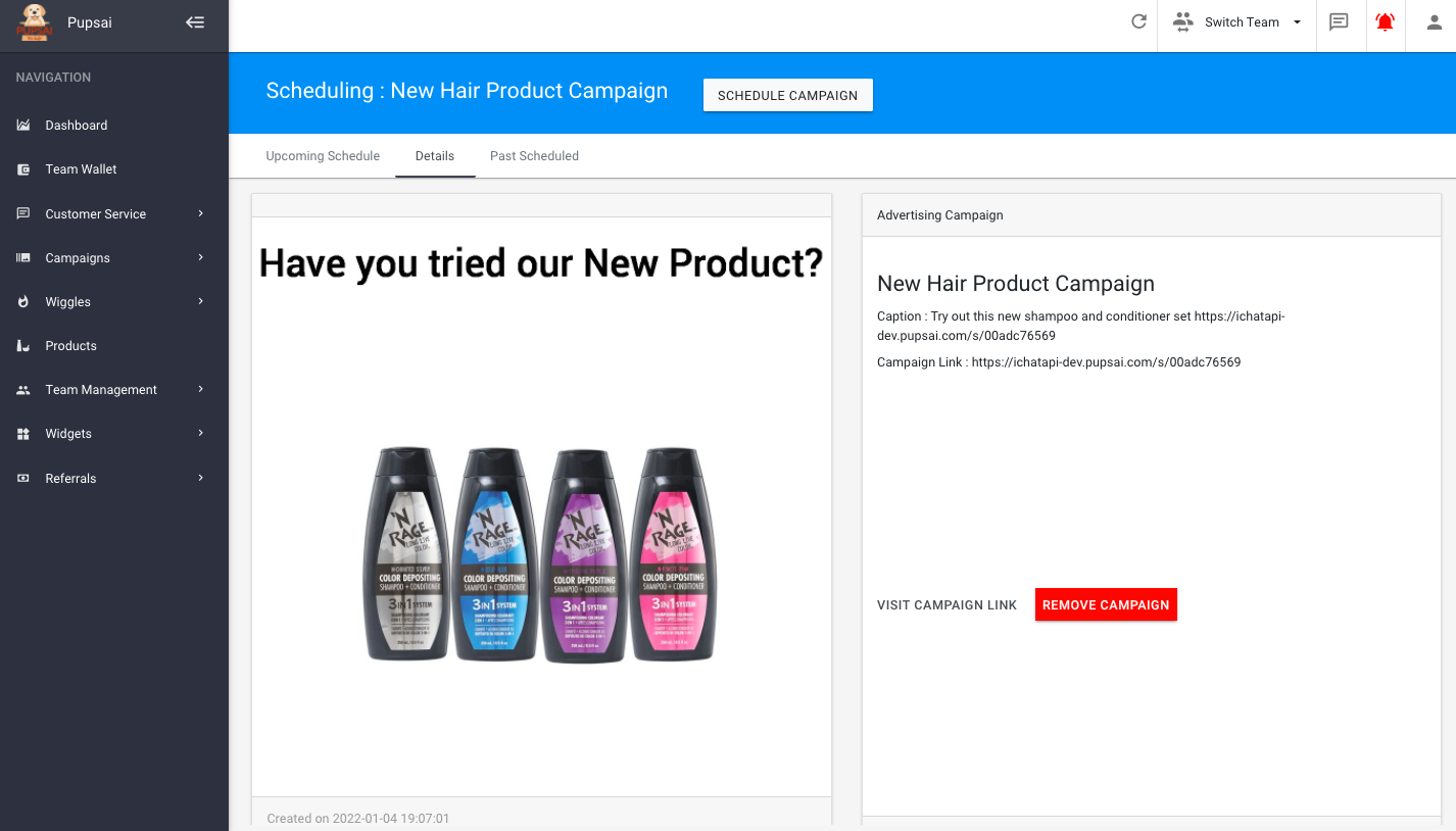 - You’ll be redirected to the “Scheduling Campaign” page. Where you can, visit the campaign link, remove the campaign or schedule the campaign. See image below