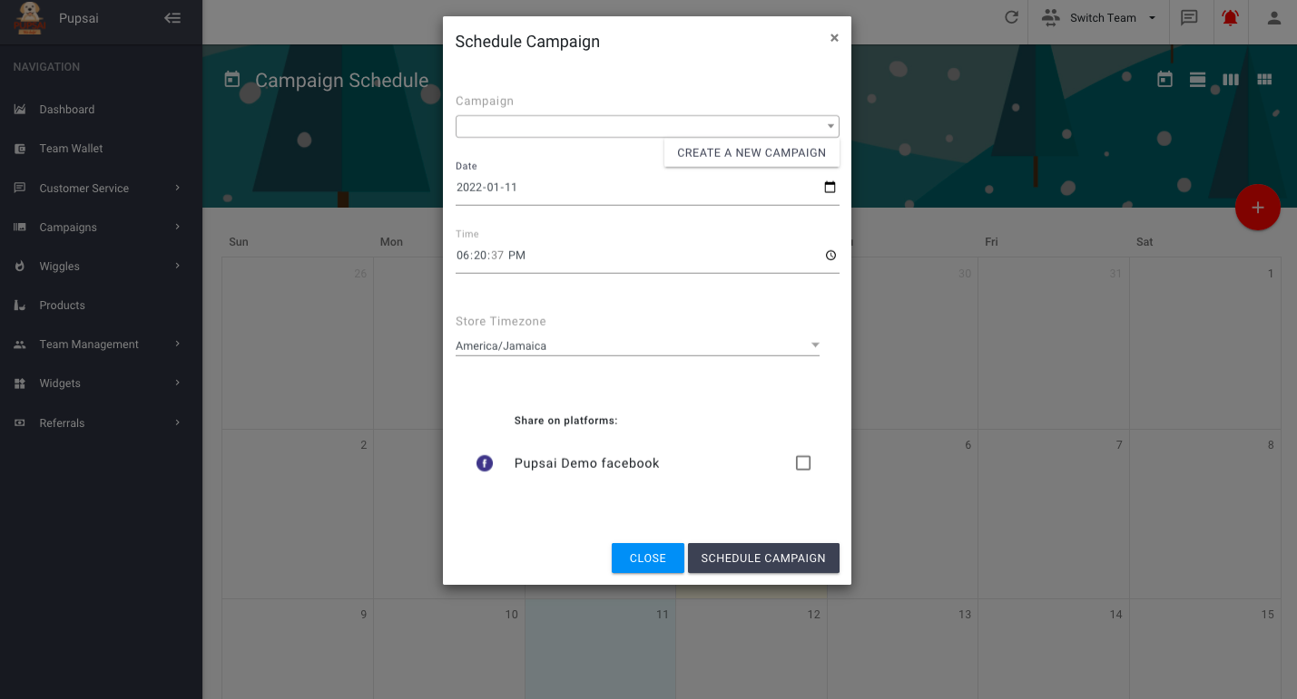 - Select the campaign date, time, timezone and the platform it should be shared on